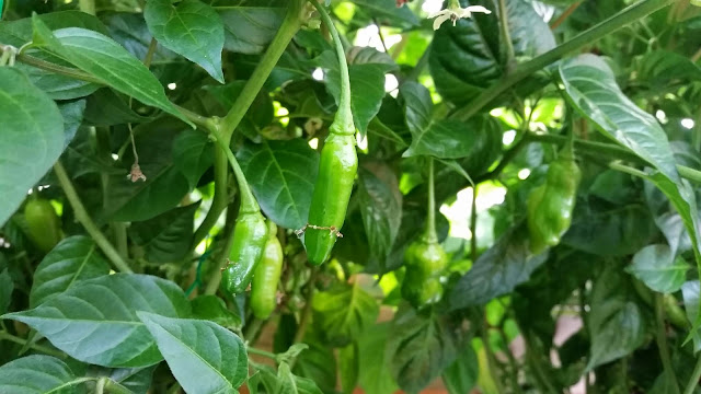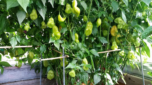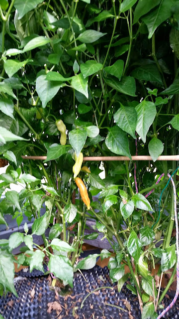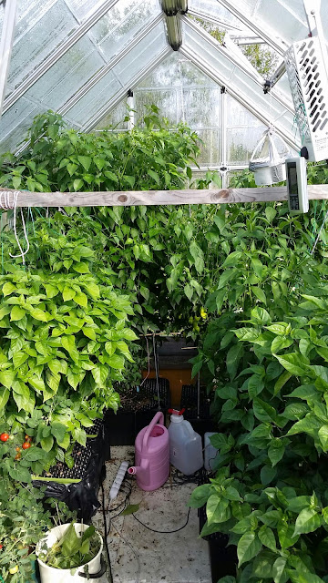 Vaikka omkin ollut varsin hyvä kesä täällä pohjoisessakin, niin chilikausi taitaa olla pettymys. Aji Fantasy teki ensimmäiset podinsa kesäkuun alussa, juuri kun oli 2 viikkoa turkissa ja sen jälkeen on tullut hurjasti viherkasvua. Alla olevassa kuvassa takana korkein on Aji Cristal, millä pituutta on yli 2 metriä lattiasta mitattuna. Aji Cristalissa roikkuu muutamia kaarileita alaosassa kasvia.